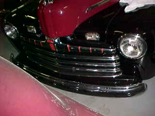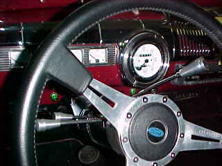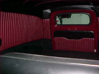 Looking over the seat at the interior of a little panel truck - great upholstery work.